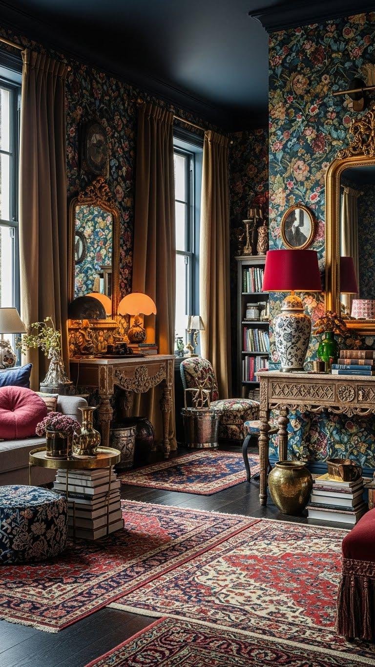 Mix bold patterns with timeworn finishes to craft a vintage maximalist living room that feels curated, not cluttered. You’ll layer ornate wallpaper with patterned rugs and heavy drapery to define zones, then place antique mirrors to reflect light and personality. Choose saturated hues, mixed metals, and sculptural lamps. You’ll edit deliberately, keeping freedom in composition while commanding visual richness.