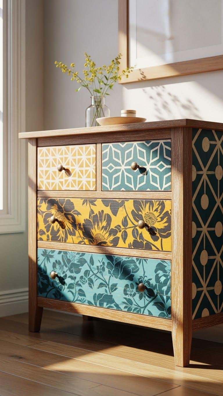 Transform a plain dresser into the room’s focal point with a handpainted finish that balances bold pattern and aged charm. You’ll choose a handpainted dresser combining floral motifs with crisp geometric patterns, then sand selectively for a confident distressed finish. Paint colors should feel freeing—rich teal, sun-worn ochre—so the piece declares personality while anchoring the room without overpowering it.