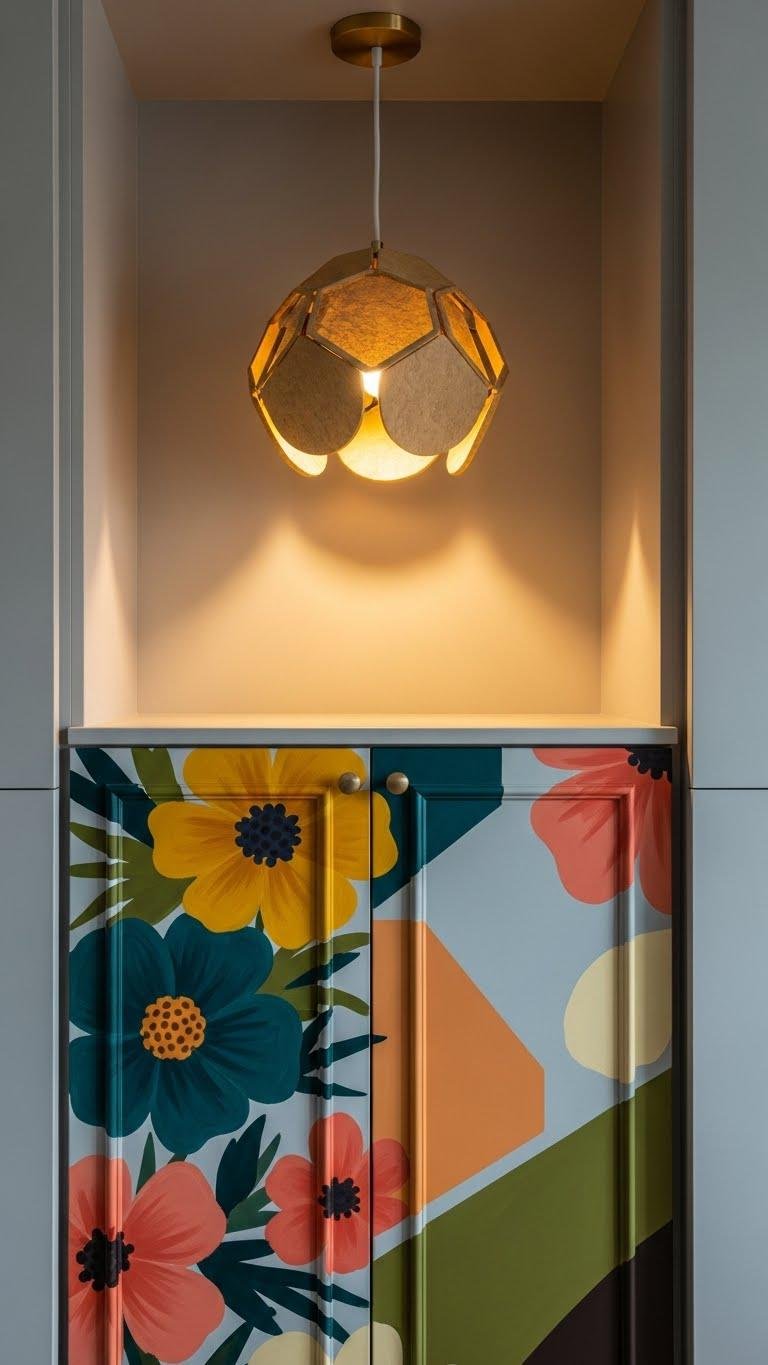 After the sculptural pendant carves a cozy pool of light, carry that sense of sculpted focus down to storage by painting a cabinet mural that anchors the nook. You’ll blend floral cabinetry motifs with bold geometric paneling, choosing a liberated palette and confident brushstrokes. The result reads like wearable art for your room: decisive, personal, and free of cliché.