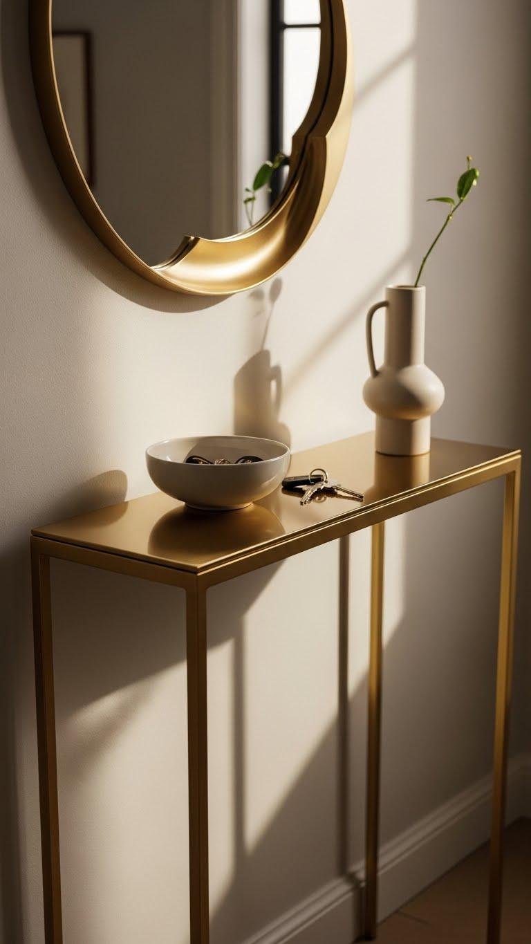 Move your eye from that velvet corner to the entryway, where a slim brass-and-lacquer table can set the tone for the whole home. You choose a brass lacquered surface that reflects light and life; a narrow silhouette keeps movement easy. Pair with a minimalist bowl for keys, sculptural mirror, and a single vase. This is practical, bold entryway elegance that invites freedom.