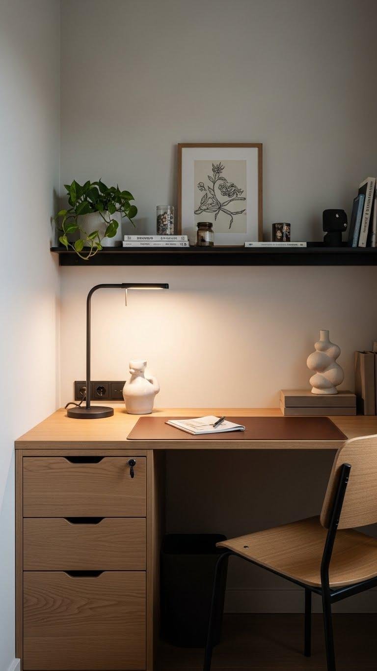 While you might be working within a tiny footprint, a “cubicle chic” desk setup makes every inch feel intentional: pick a slim-profile desk with integrated storage to keep clutter hidden, mount a shallow shelf or peg rail above for curio-sized decor and task lighting, and anchor the space with a tactile desk pad and one sculptural object so it reads as designed rather than improvised. Embrace compact ergonomics, hidden storage, and clean lines that let you move, create, and breathe.