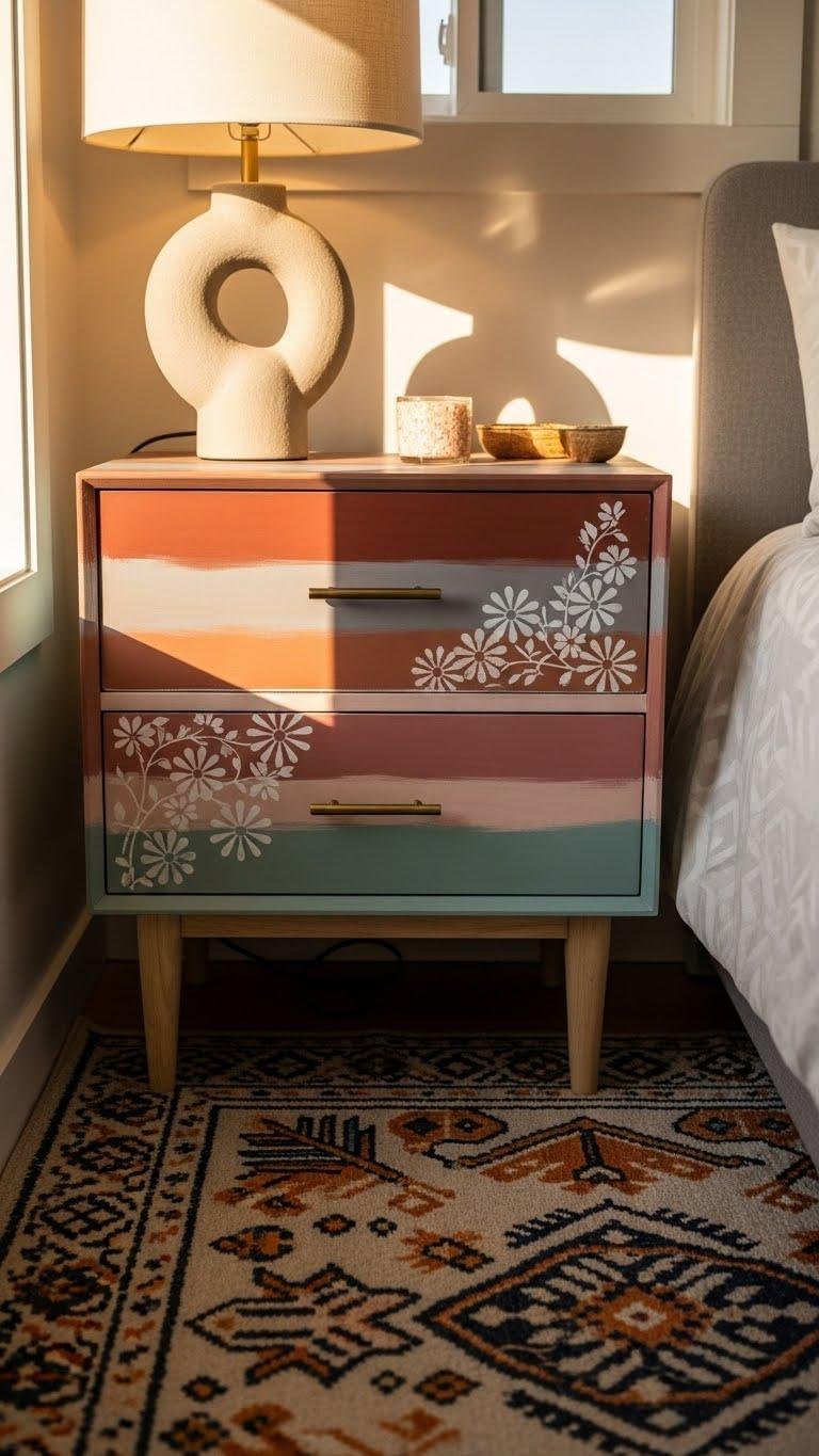 After anchoring your tiny room with a bold patterned rug, give the bedside a quick, high-impact refresh by handpainting the nightstand to echo those colors and textures. You’ll strip minimal hardware, apply chalk paint in layered washes, then use floral stencils for controlled whimsy. Seal, reattach pulls, and position a sculptural lamp — you’ve created a portable statement that feels free and intentional.