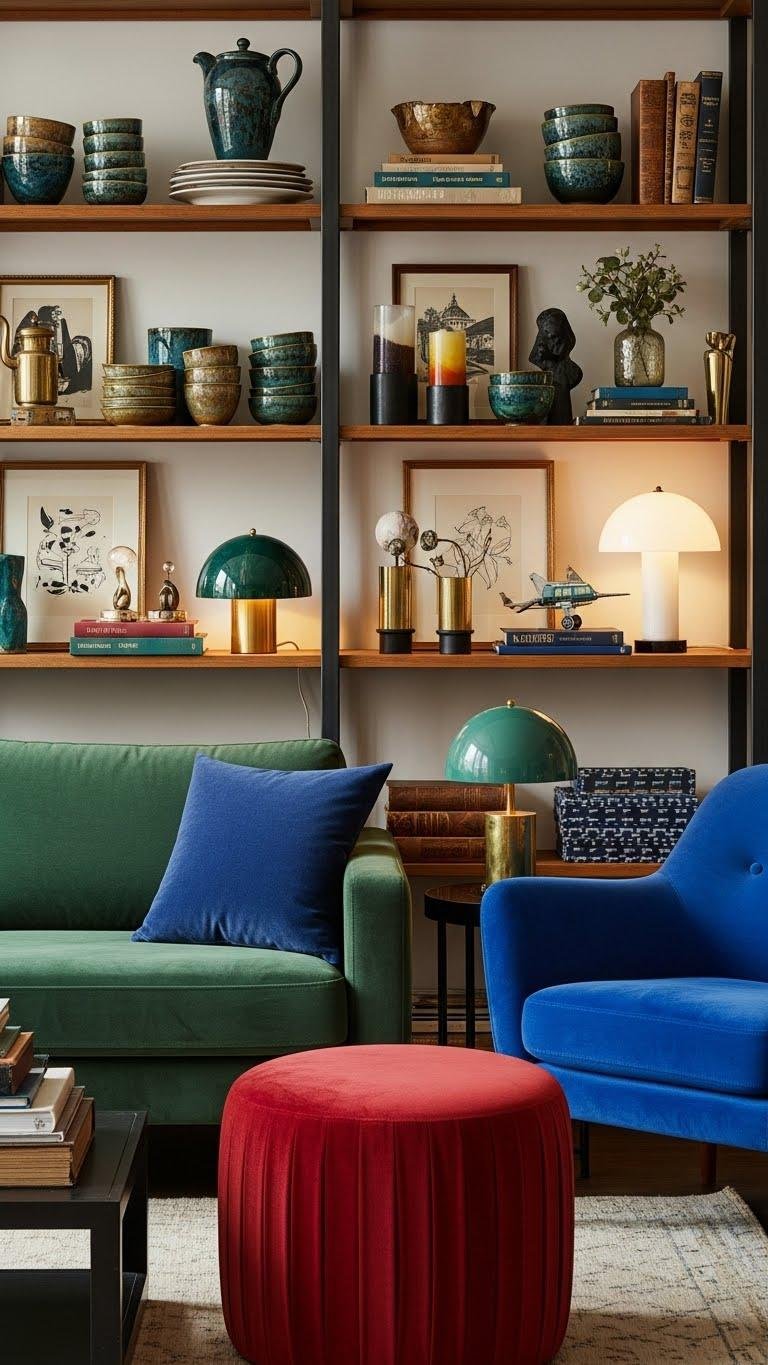 Pair jewel-toned furniture with curated vintage pieces on open shelves to give the room lived-in polish and visual stories. You’ll arrange color blocking vignettes — stacked ceramics, brass accents, and framed prints — that balance bold hues and negative space. Mix curated ledgerbooks, travel finds, and sculptural objects so each shelf feels intentional, free, and easy to live with.