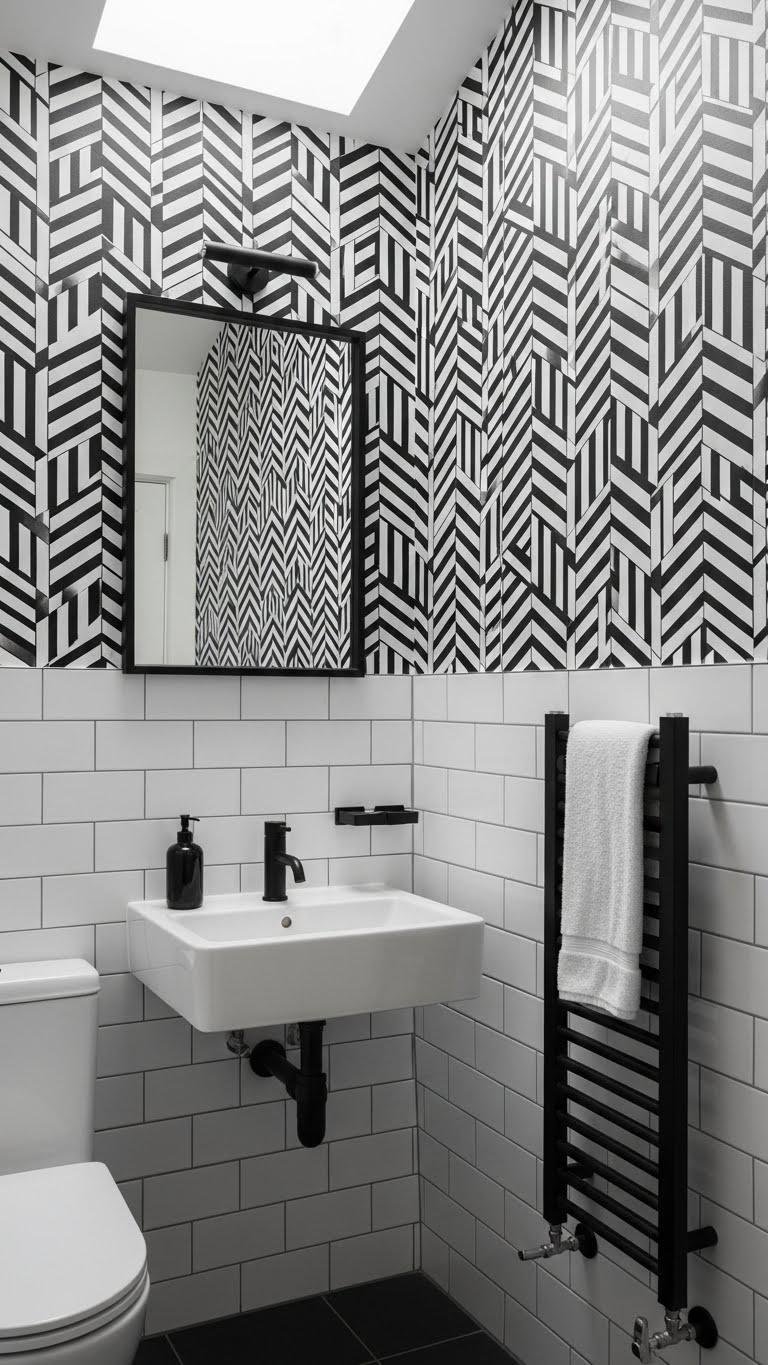 In a small bathroom, bold geometric wallpaper instantly sets the tone, turning walls into a deliberate design statement you don’t have to overwork. You’ll pair it with matte fixtures and crisp grout to evoke graphic tilework without tiling.