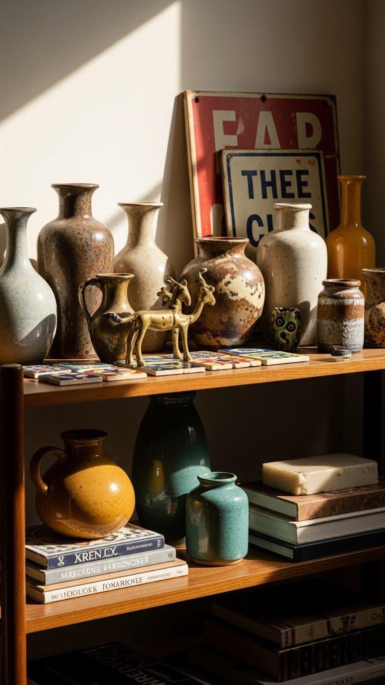 Mix in mismatched treasures to create a display that feels curated, not cluttered — start with a sturdy shelf or console as your anchor, then layer objects of varied scale, texture, and era so each piece gets its moment. You’ll mix thrifted mosaics, brass kitsch, worn ceramics and vintage signage; group by color or story, leave breathing room, swap pieces freely to keep the look alive.