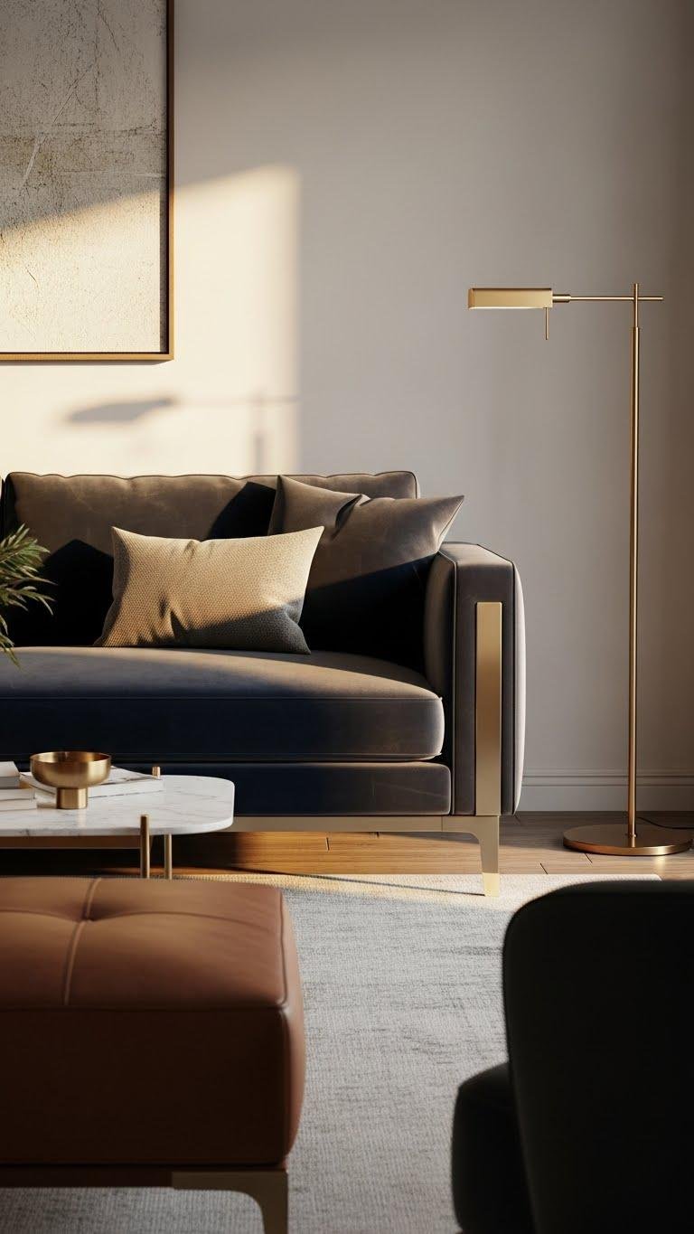 Anchor the seating area with a velvet sofa trimmed in brass—its plush upholstery catches light while slim metal legs and a brushed brass trim add a refined edge. You’ll use plush contrasts to layer throw pillows and a leather ottoman, creating tactile freedom. Embrace brass detailing with a minimalist coffee table or lighting, letting the sofa command the room without clutter or compromise.