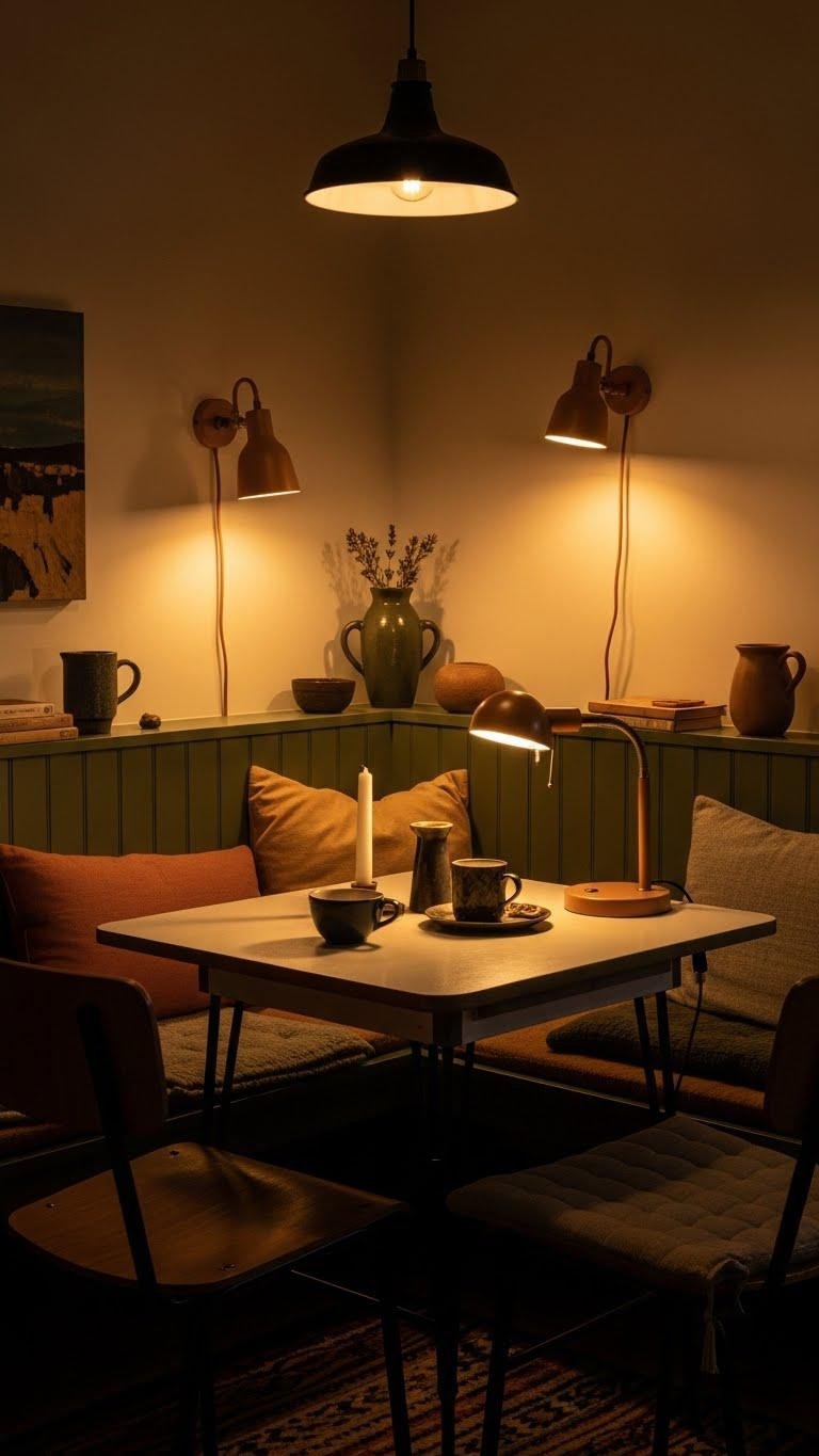 After you’ve arranged your thrifted vignette, let lighting take the lead in making the scene feel warm and lived-in. You’ll balance overhead glow with soft dimmers and layered sconces to sculpt pockets of comfort. Aim for adjustable warmth, shadow play, and readable task light. This mix gives you freedom to shift mood instantly—intimate evenings, productive days, or spontaneous gatherings.
