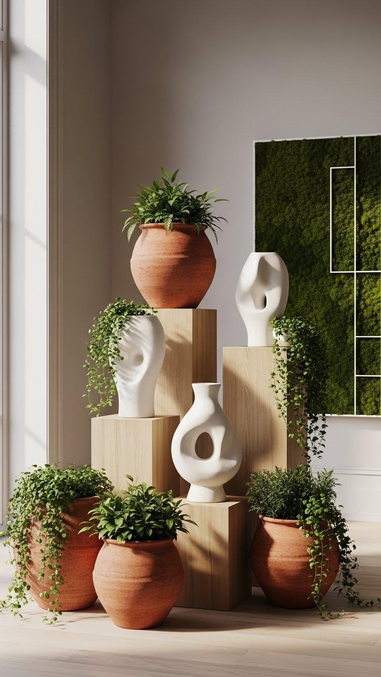 When you carve out a botanical corner with sculptural planters, you turn a simple cluster of green into a deliberate focal point that reads as art. Place textured terracotta pots and sleek ceramic sculptures together, let trailing vines spill freely, and mount a minimalist mosswall for contrast. You’ll craft a liberated, gallery-like niche that feels intentional, alive, and utterly yours.