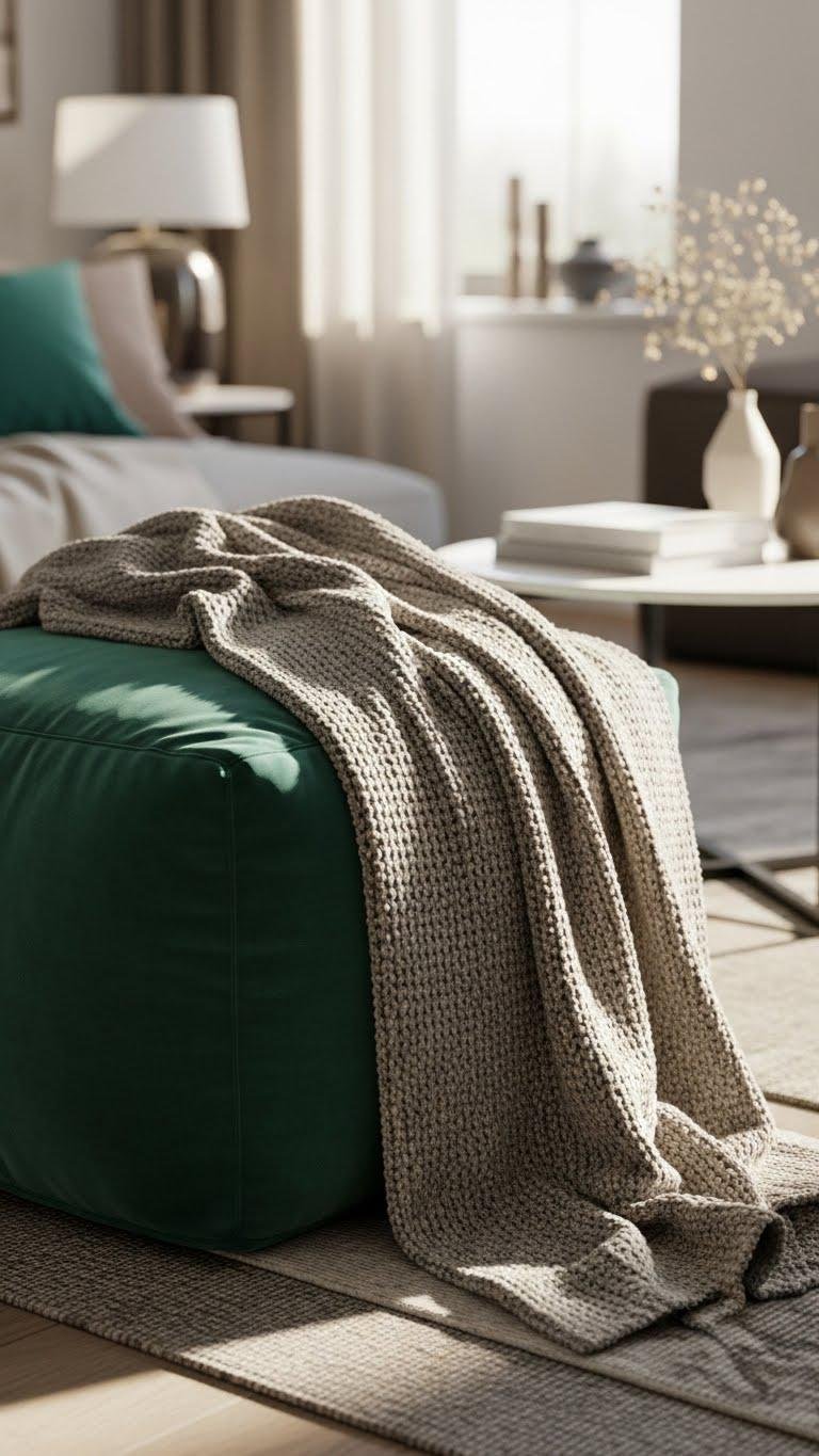 Choose a velvet pouf in a bold hue and drape a neutral bouclé throw for striking color contrast and relaxed elegance.