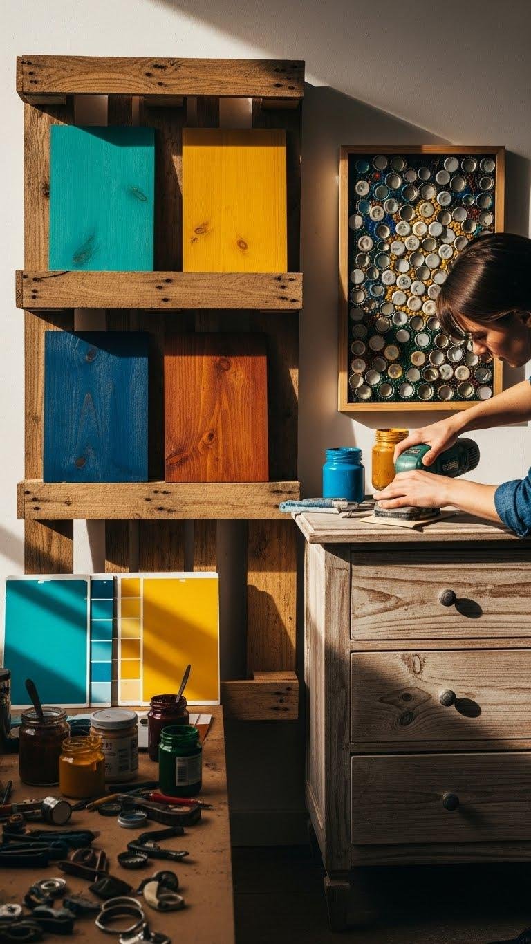 Breathe new life into tired furniture by upcycling pieces you already own—it’s creative, budget-smart, and surprisingly transformative. You’ll sand, paint, and refinish with bold hues or natural stains to reclaim freedom in your space. Use a salvaged pallet for shelving, glue bottle cap accents for texture, and swap hardware for unique pulls. The process is hands-on, empowering, and instantly personal.