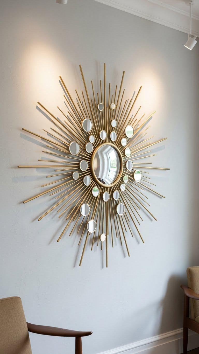 Framing a wall with a sunburst mirror instantly lifts the room, its radiating spokes catching light and drawing the eye to a sculptural focal point. Position a central mirror, then add brass rays variations and a mini cluster of smaller discs to expand movement. You’ll create effortless drama and a liberated vibe—balanced, bold, and sculptural without overpowering your space.