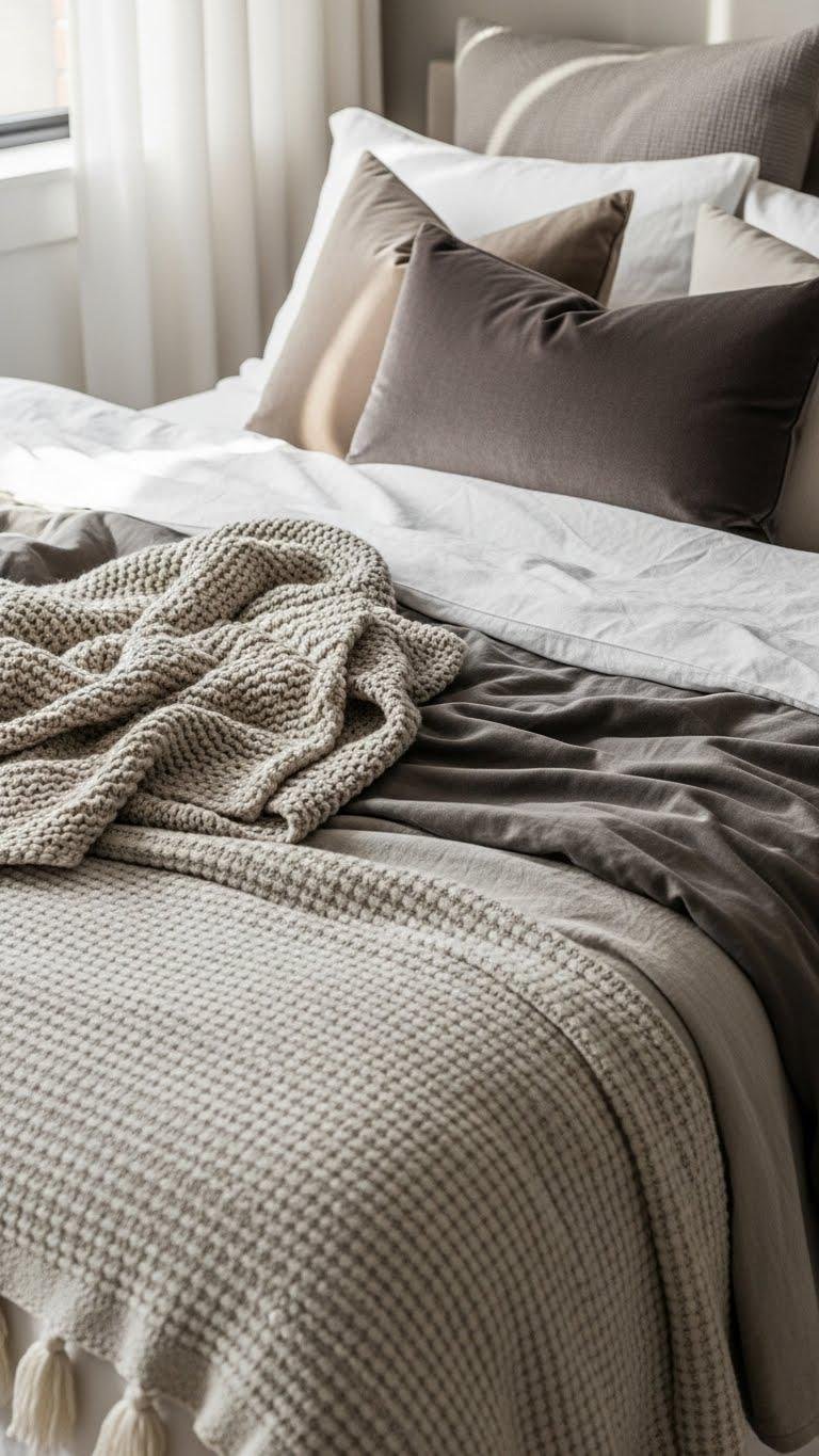 Layering mixed textures on your bed instantly adds depth and tactile interest without changing color or pattern dramatically. You’ll combine crisp linen, chunky knit throws, smooth velvet pillows and a woven throw for intentional texture contrast while keeping calm.