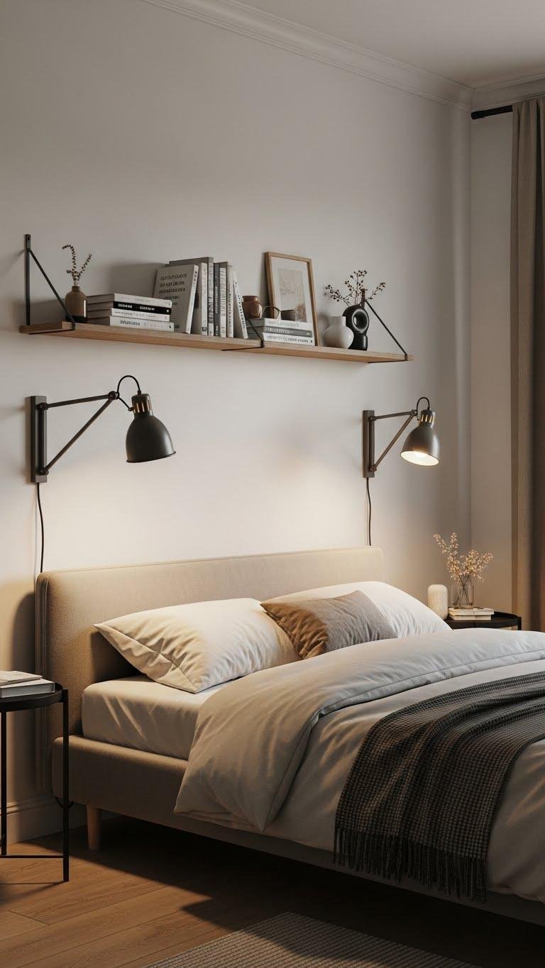 With the bed anchored on the longest wall, free up floor space and keep surfaces uncluttered by adding wall-mounted shelves and lights. Install floating bookshelves for curated displays and easy reach, then mount adjustable sconces for targeted reading or soft ambient glow. You’ll maintain a clean, open feel while customizing light and storage, creating a calm, liberated bedroom without bulky furniture.