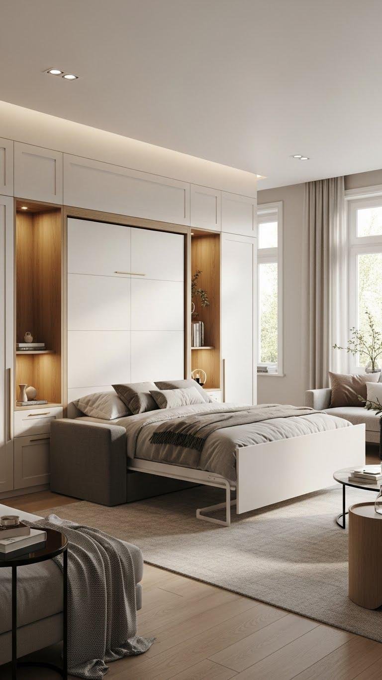 If you want your living room to double as a guest suite without sacrificing style, a horizontal Murphy bed is a clever, low-profile solution that reads like built-in furniture instead of a temporary mattress.