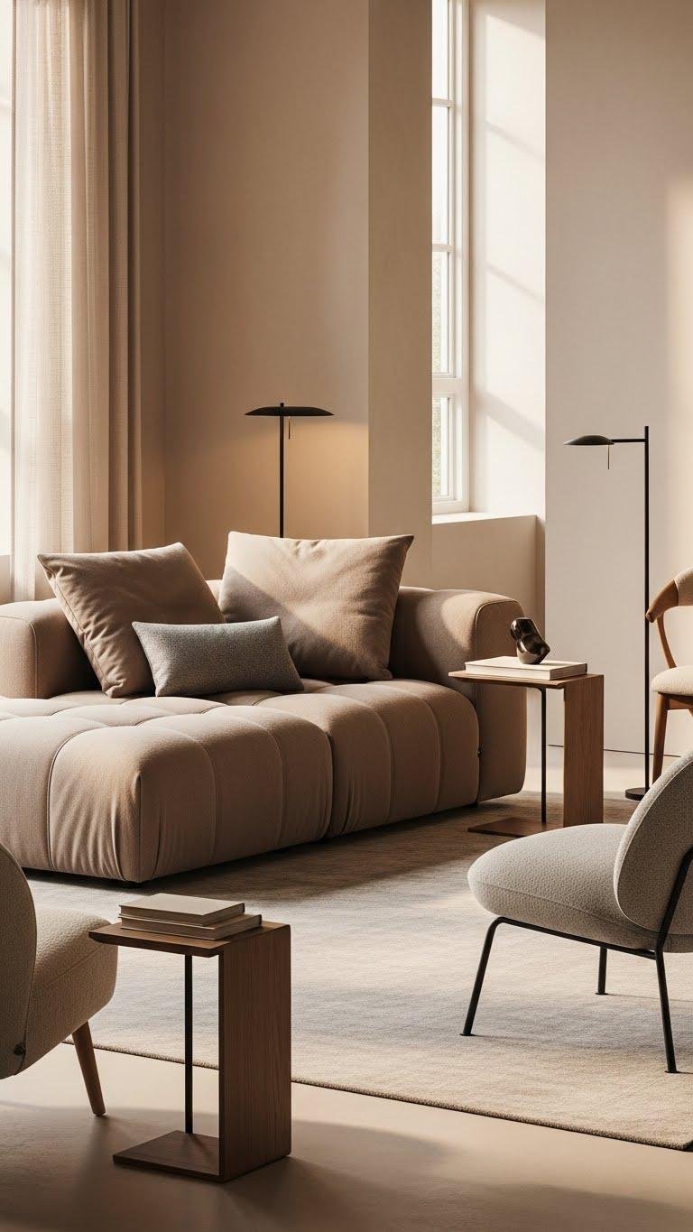 Pair a generously scaled sofa with slim accent pieces to keep the room feeling grounded yet airy—think a deep, cushioned settee framed by narrow-legged side tables, slim-profile floor lamps, and delicate accent chairs. You’ll balance a modular chaise or oversized sofa with slim armchairs and tapered legs, favoring negative space and clean lines so the layout breathes and still reads modern, liberated, intentional.