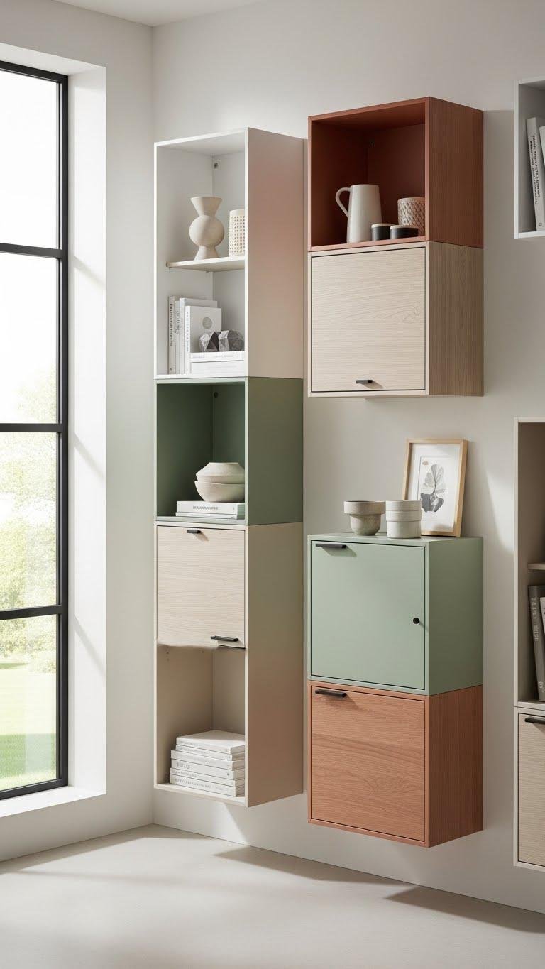 Introduce EKET-style cabinets to mix open shelving and concealed storage, giving you flexible display space without sacrificing a tidy silhouette.