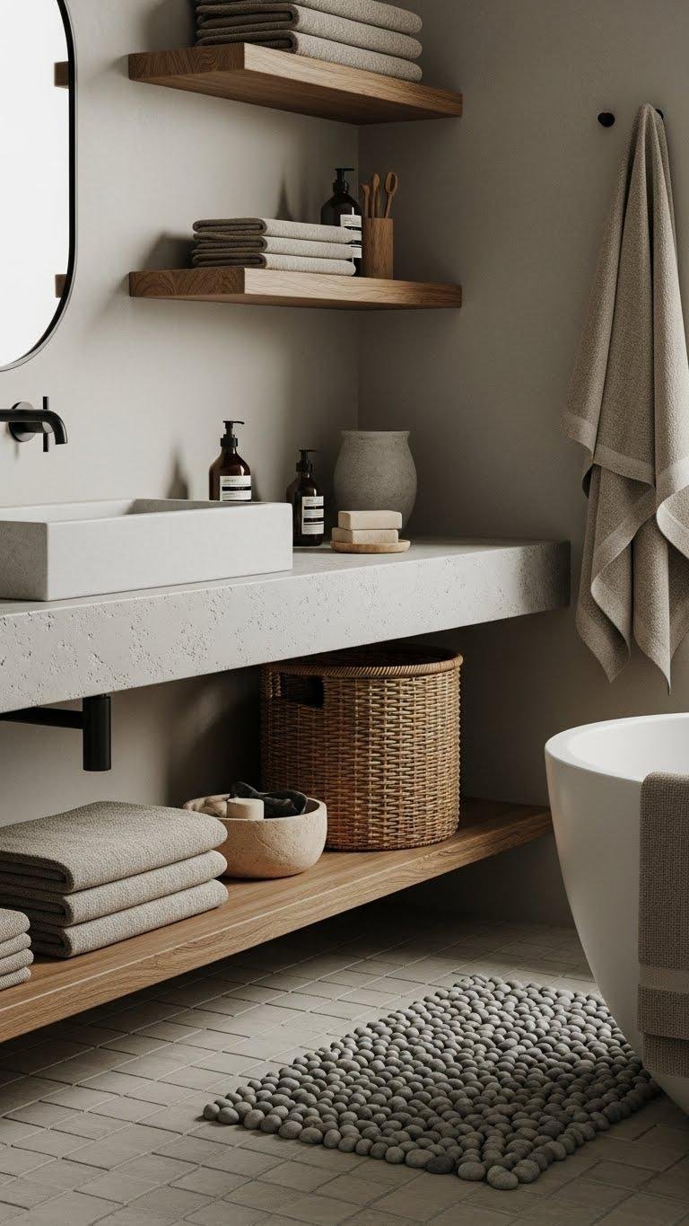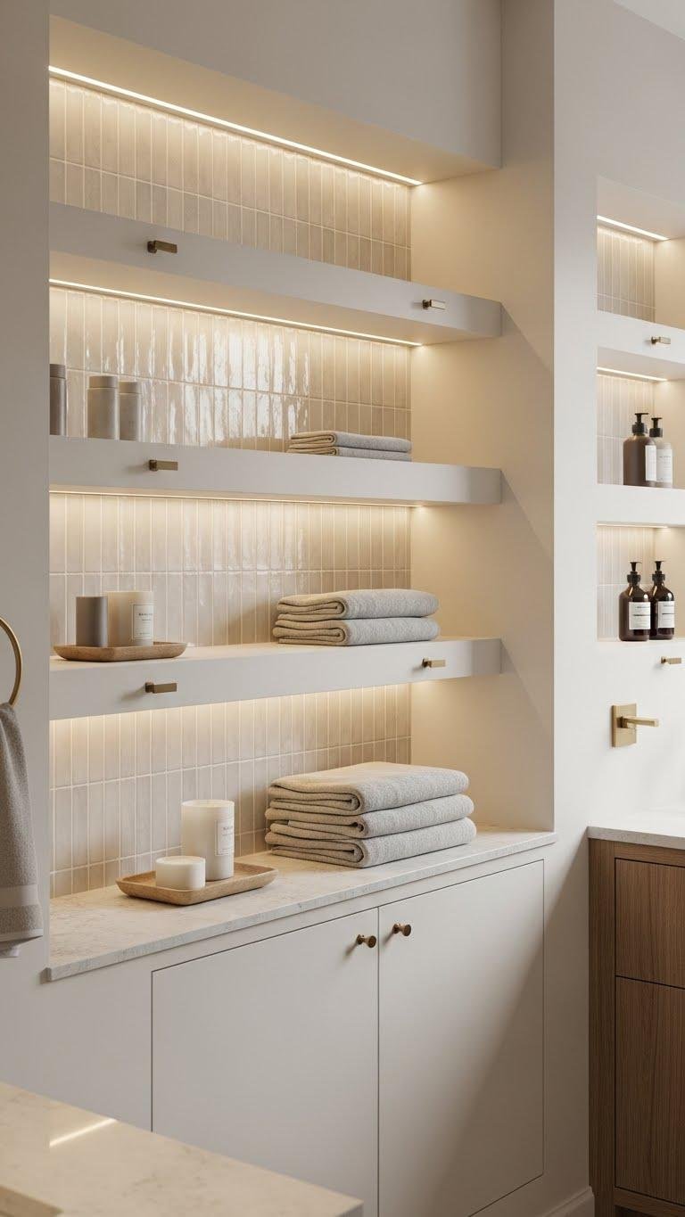 When you tuck storage into the wall, niches and recessed shelves free up surfaces while keeping the room visually seamless; they’re a subtle way to maintain that open, spa-like feeling without sacrificing function.