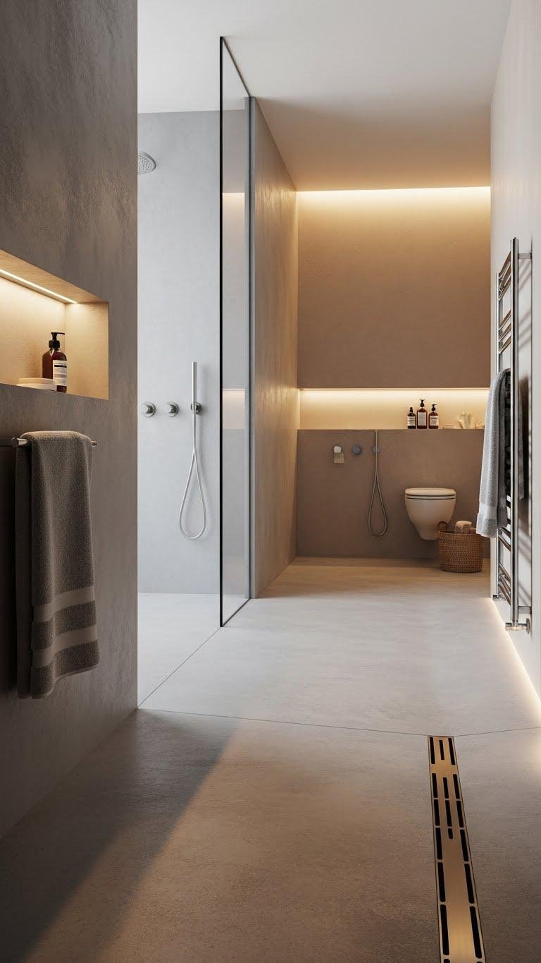 Pair heated concrete underfoot for warmth and durability, and plan wet room lighting to highlight textures without glare. This approach frees movement and emphasizes calm, uncluttered design.