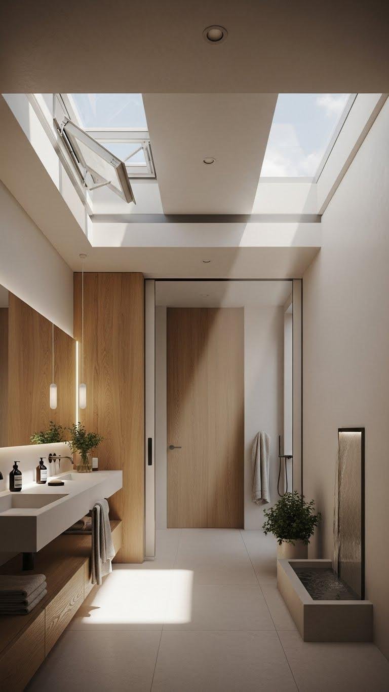 You’ll plan skylight placement to capture sun angles, reduce glare, and respect privacy. Use clerestory glazing for consistent top-lit illumination and ventilation. Thoughtful framing, thermal considerations, and operable options keep the bath airy, private, and effortlessly freeing.