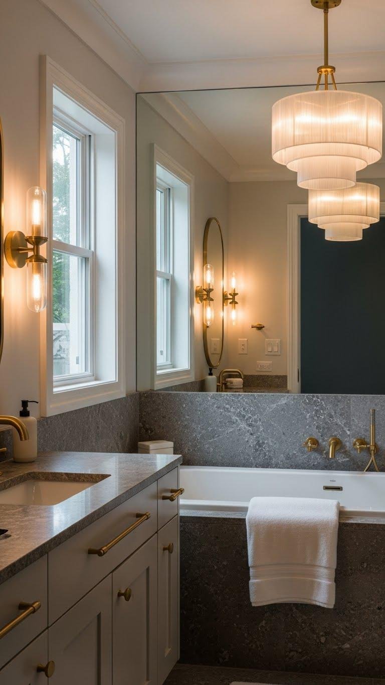 When you upgrade lighting and fixtures, choose interventions that change perception instantly: swap harsh downlights for dimmable LED sconces and a statement pendant over the tub, specify CRI >90 sources to render materials faithfully, and pick fixtures whose scale and finish read like jewelry against tile and stone.
