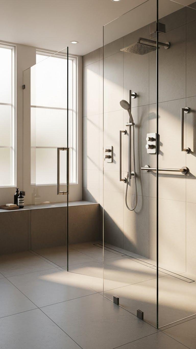 Step into seamless movement by designing a walk‑in, zero‑threshold shower that blurs barrier lines and prioritizes accessibility, water control, and clean sightlines. You choose a gentle slope drain, concealed linear grates, and slip-resistant, pet friendly flooring that cleans easily. Frameless glass keeps sightlines open, built-in benches and handrails guarantee accessible entry, and adjustable fixtures let you tailor spray and temperature for liberating daily ritual.