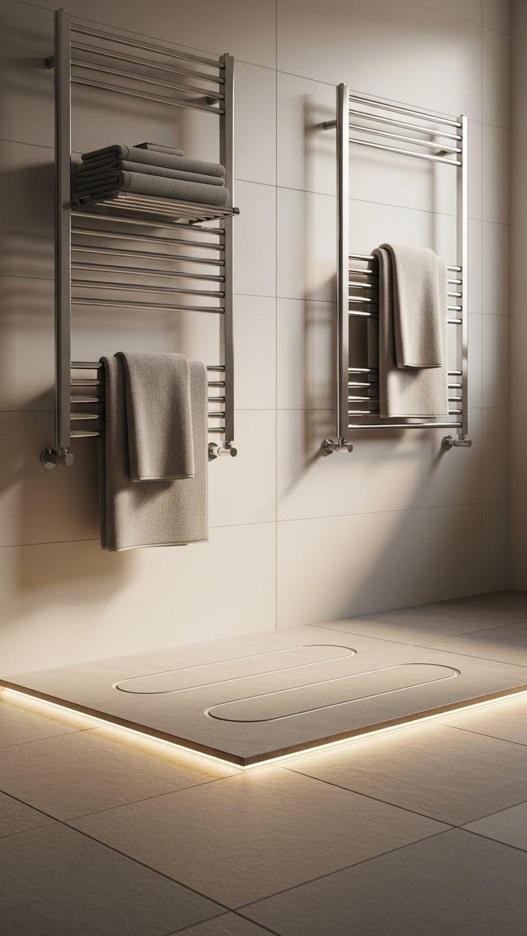 Warm up your routines and streamline the room’s look by installing heated towel rails and underfloor heating—both add tangible comfort while preserving clean sightlines. You’ll enjoy crisp, dry towels on a sleek heated towelrails ladder and consistent warmth from radiant flooring beneath your feet.