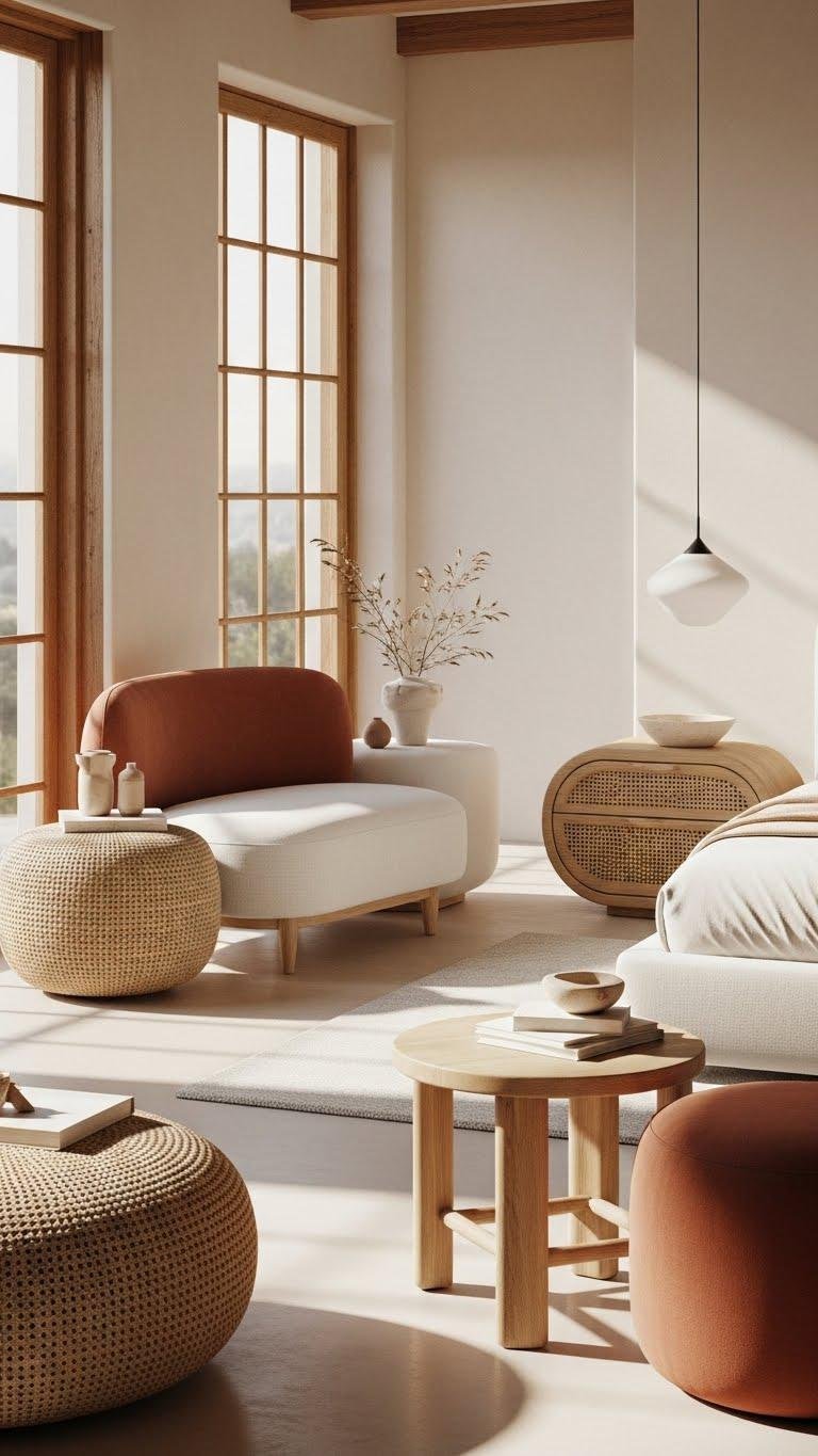 You’ll choose sculptural ottomans and rounded nightstands to create gentle lines that encourage relaxation.