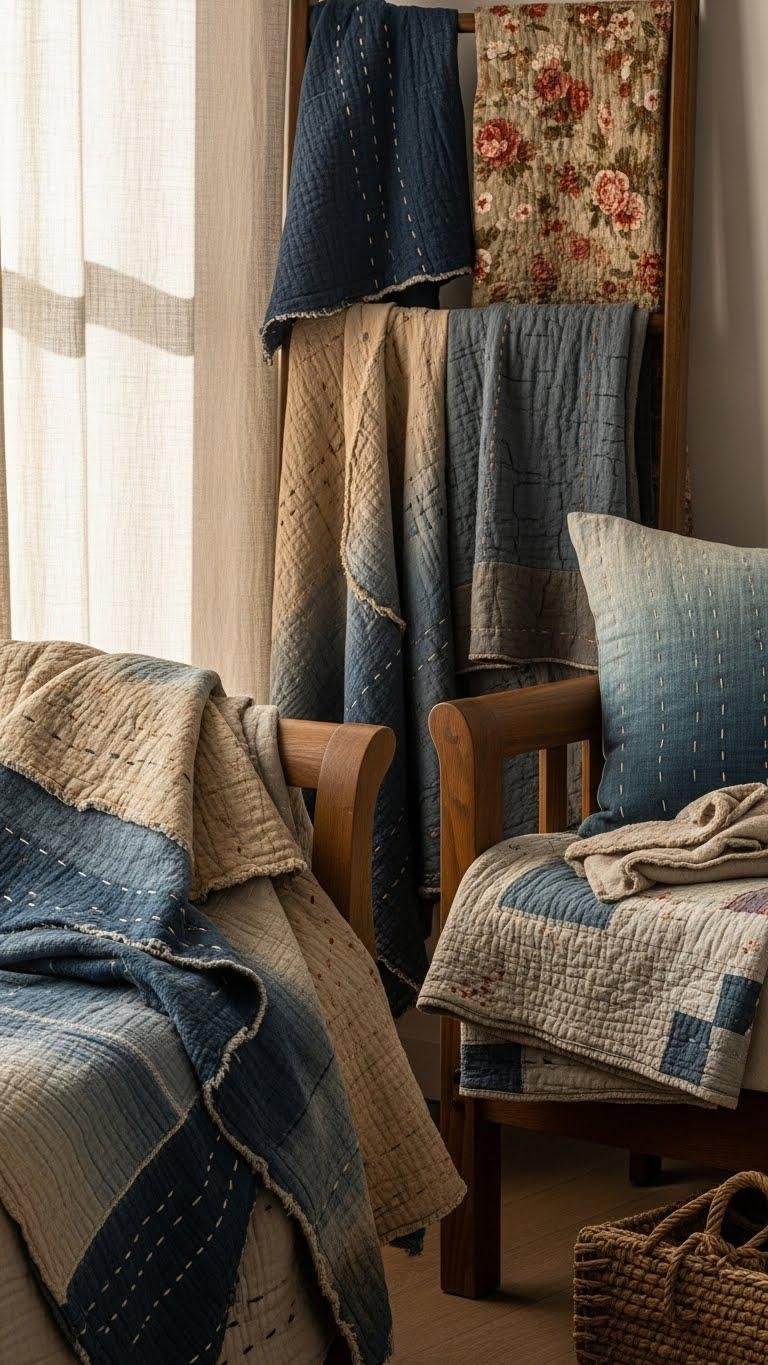 You’ll layer hand stitched pieces and heirloom fabrics to tell a story, mixing subtle color dyeing and natural indigo tones. Let these textiles breathe—swap seasonally, drape casually, and display them with intentional, unforced ease.