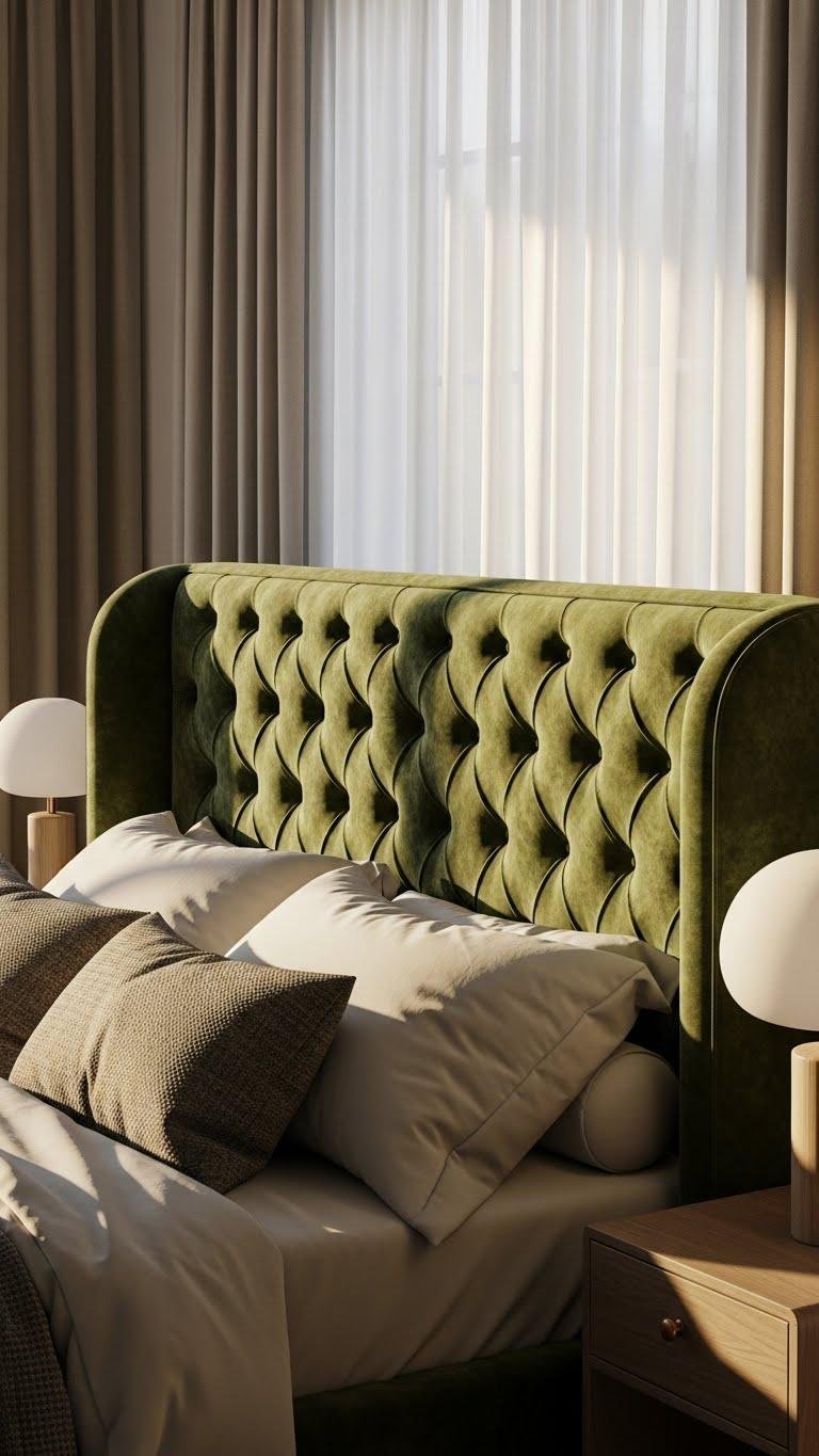Bring a padded, curved headboard into your bedroom to instantly soften the space and invite relaxation. Choose a tufted velvet piece with a gentle rounded silhouette to create tactile warmth and visual calm. You’ll lean back comfortably, read, or linger without fuss. A well-proportioned headboard anchors the room, signals intentional design, and supports a liberated, restful vibe.