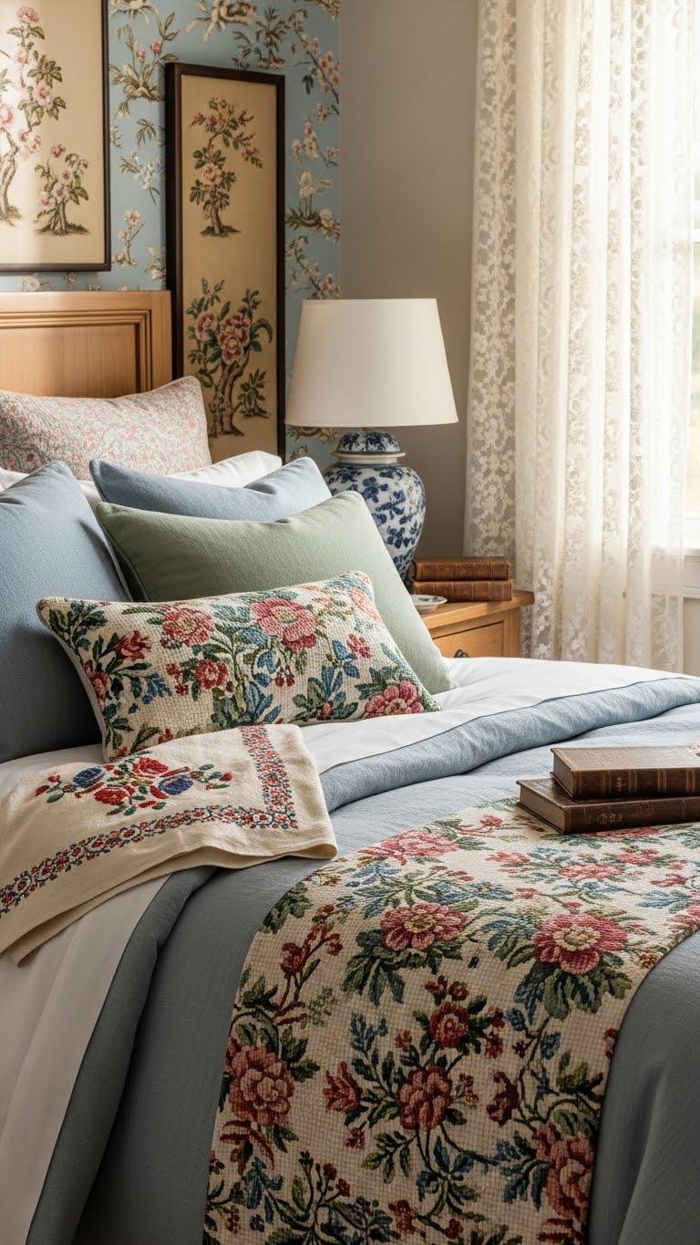 You can pair heritage florals with bold needlepoint motifs on cushions or a runner, then balance patterns with solid linens and warm wood.