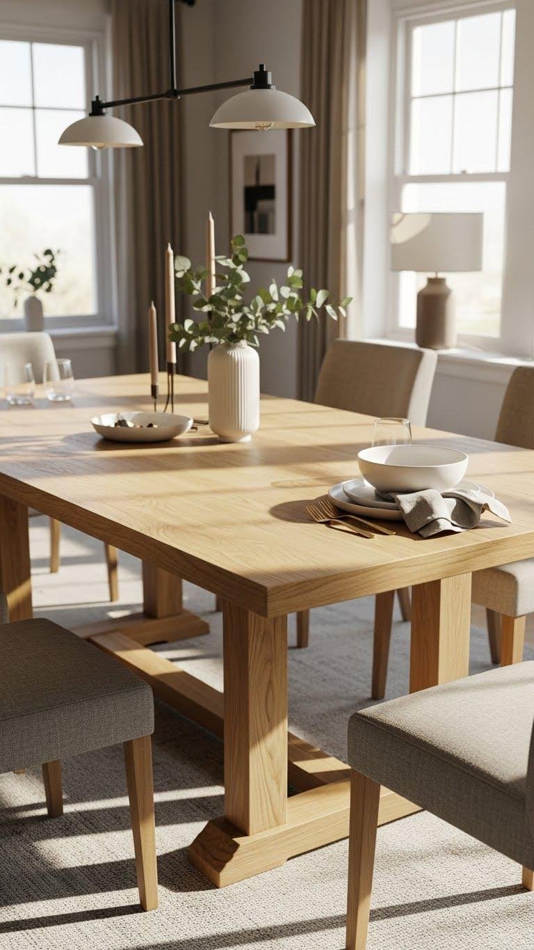 A warm light wood base can anchor your dining room with effortless charm, its honeyed tones bringing a natural glow that complements both modern and traditional settings.