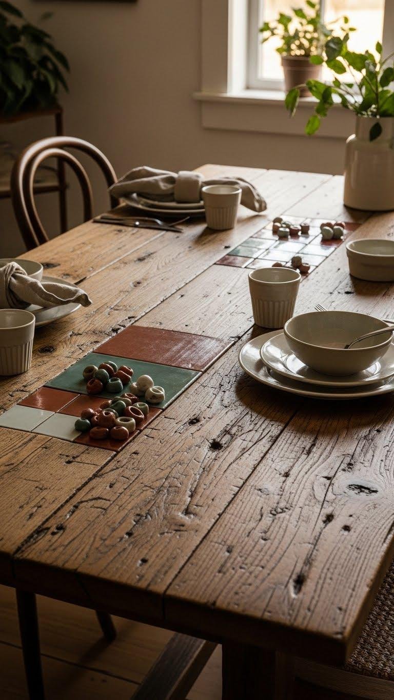 Blending weathered character with artisan finesse, reclaimed wood tables with ceramic details give your dining room a tactile, storied centerpiece you’ll notice every time you sit down. You’ll pair handmade ceramics inset or clustered along a seam to honor craft and add color. Embrace patina preservation—seal judiciously, retain nicks—and let the table evolve, inviting relaxed gatherings that feel utterly yours.
