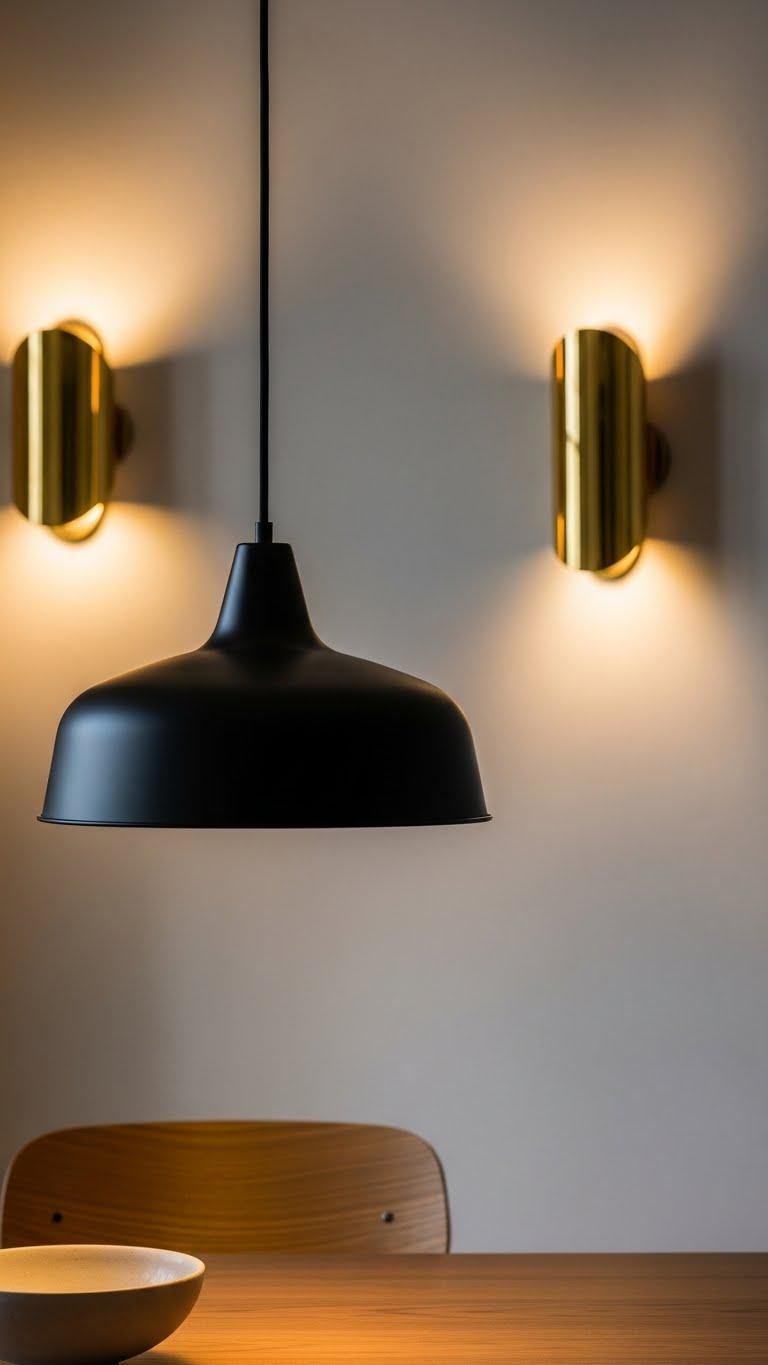 Pair matte black with brass and you’ll get a look that’s both modern and timeless—black trims the silhouette with graphic clarity while brass adds a warm, reflective counterpoint that lifts the whole composition. You’ll choose matte black pendants to anchor the table and brass accent sconces to punctuate walls, creating layered contrast that feels liberated, elegant, and effortlessly curated.