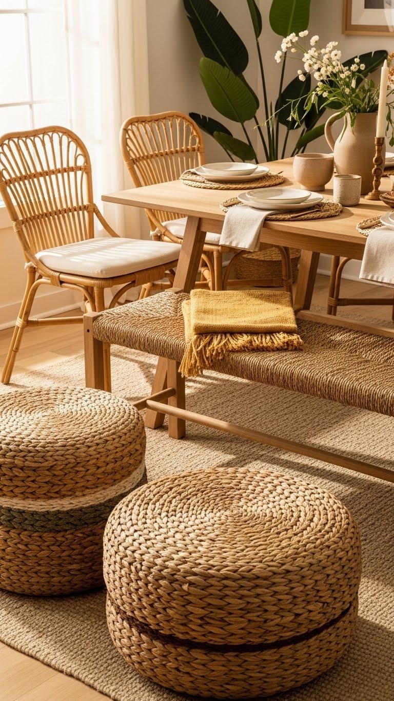 Woven seating — rattan chairs, seagrass benches, and wicker stools — brings immediate tactile warmth to a dining room and anchors the space with natural rhythm and texture.
