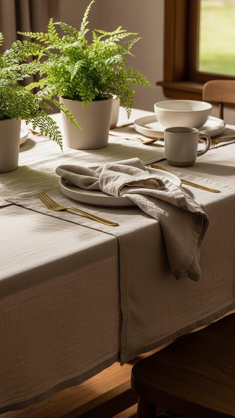 Pairing linen tablecloths with your potted ferns keeps the room feeling connected and effortless: the soft drape of neutral linen echoes leaf textures while grounding the table in warm, organic tones. You’ll layer a neutral runner and matching linen napkins for tactile harmony, add simple ceramics, and let natural light highlight fibers — creating a calm, unfussy dining space that invites relaxed, liberated gatherings.