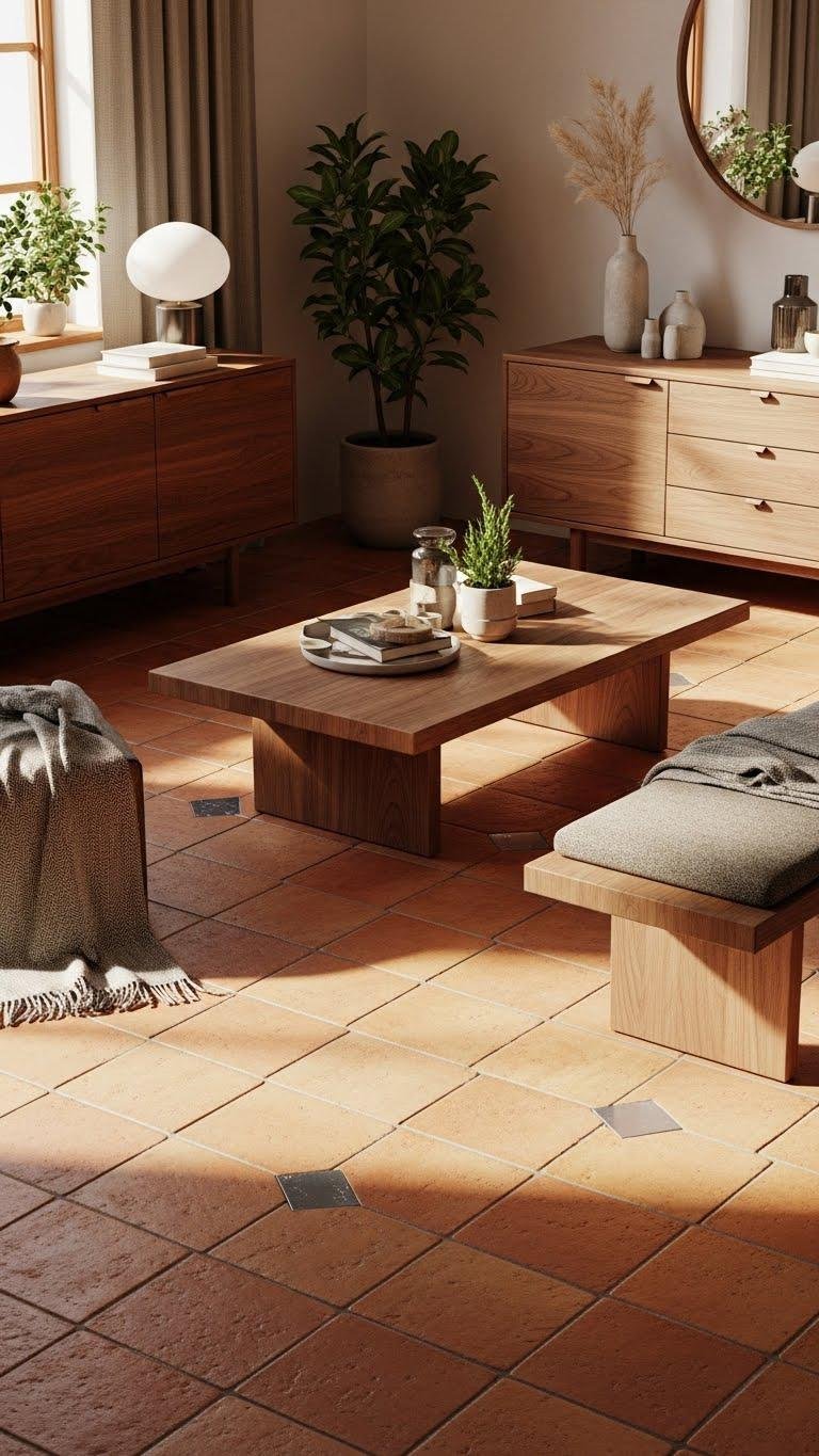 While lacquered accents lift a neutral scheme with cool gleam, bringing in terra-cotta flooring and warm woods grounds the room with tactile warmth and sunlit color. You’ll pair sun baked, clay tones with heated terracotta tiles for cozy underfoot warmth, then offset them with warm oak or walnut furniture to echo the stone look. The result feels liberated, rooted, and vividly inviting.