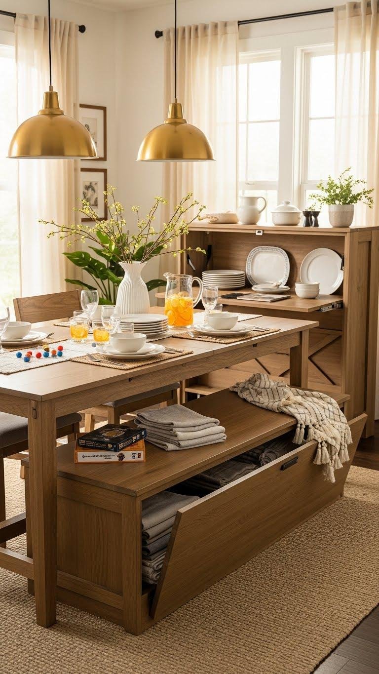 Choose a convertible bench for seating that tucks away or opens to store linens, and a folding buffet that expands for serving then collapses to save space.