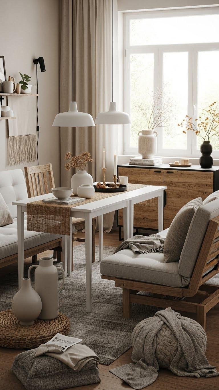 You’ll want a warm wood table as your anchor, then layer texture, soft lighting, and mixed seating to make the room feel lived-in without looking cluttered. Think terracotta accents, woven chairs, muted linens, and sculptural mirrors that catch sunlight—small edits that change the mood. Keep functionality in mind and let thoughtful contrasts guide you; the next ideas will show how to pull it all together.