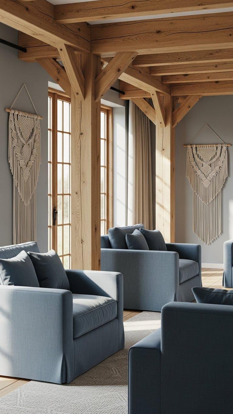 After layering soft macramé on the wall, anchor the room with muted blue upholstery that feels both calm and collected against exposed natural beams. You’ll choose soft slate cushions and linen slips that echo coastal restraint, letting timber warmth breathe. Mix streamlined chairs with open sightlines so you can move freely, enjoy airy elegance, and host without ceremony.