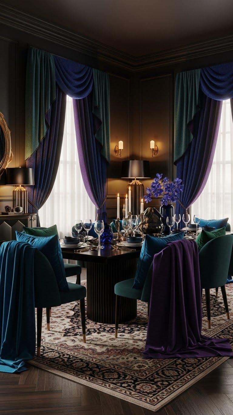 If rich, inky walls set a cinematic tone, jewel tones turn that mood into sumptuous luxury—think emerald, sapphire, and amethyst wrapped around your table.