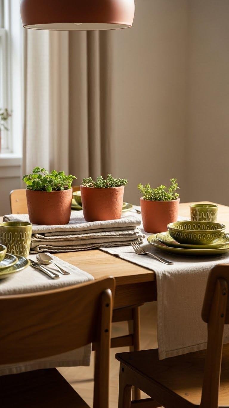 Place herb centerpieces on a sideboard or windowsill so you can snip fresh sprigs while dining. These living accents free your space, introduce scent, and cultivate a relaxed, liberated atmosphere.