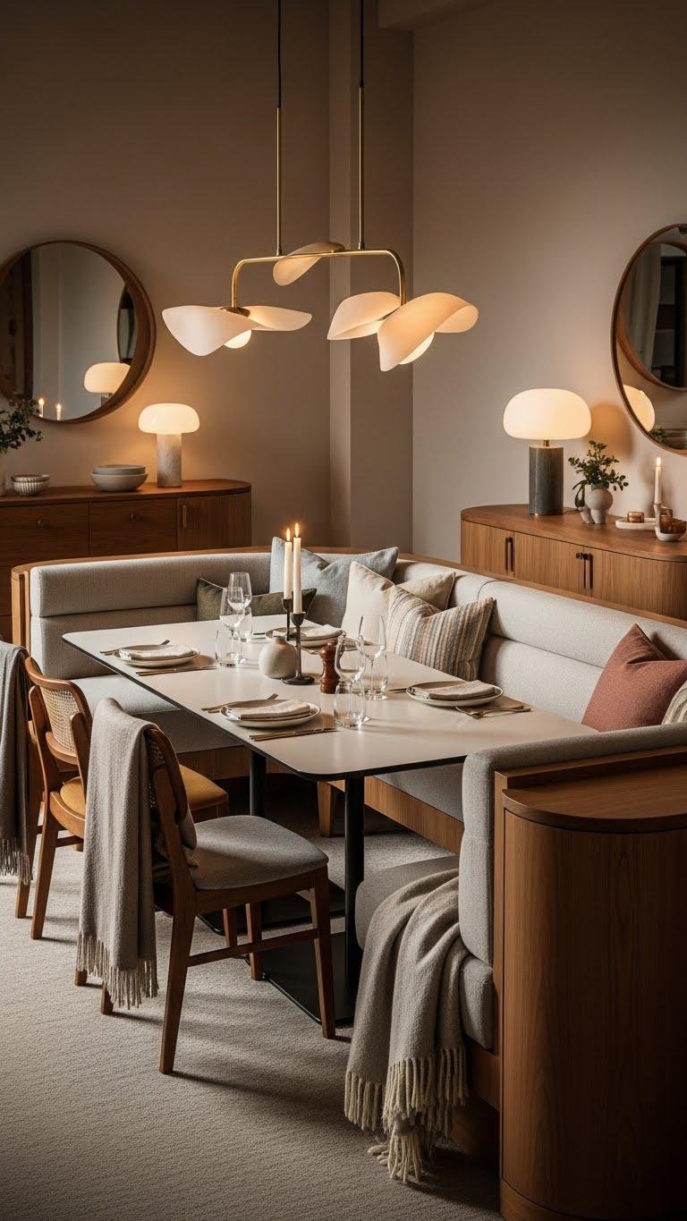 You’ll choose curved banquettes to hug guests, pair them with rounded sideboards for flowing storage lines, and mix gentle lighting and organic textiles.