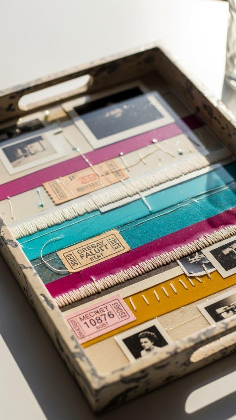 Bring together paper, fabric, found objects, and a slick resin finish to create a mixed-media collage tray that’s equal parts art and everyday utility. You’ll build textured backgrounds with gesso, paint, and stitching, then arrange ephemera layering—tickets, photos, scraps—for rhythm. Seal everything in resin for durability and shine. Use bold color pops and negative space to keep the tray modern and freeing.