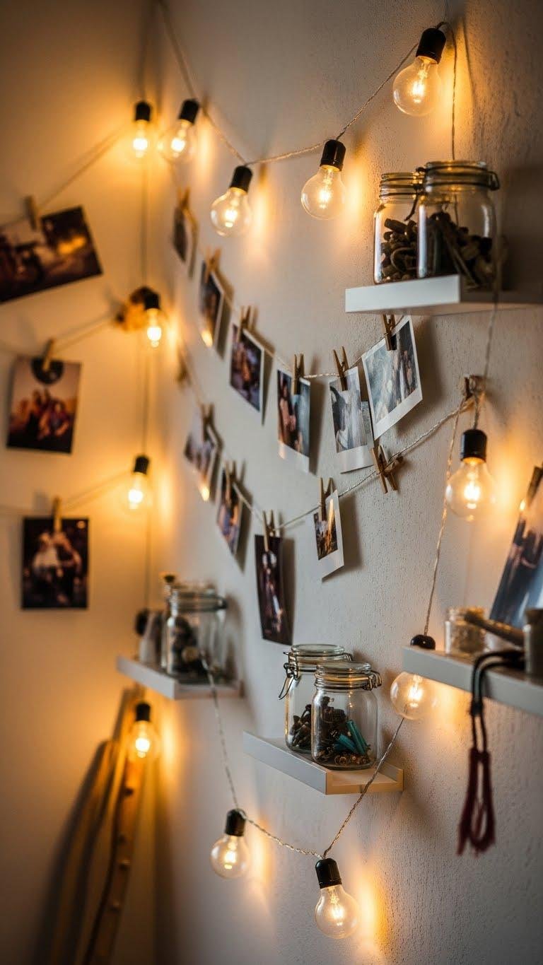 Brighten up a wall with a personalized string-light display that mixes warm bulbs, photos, and small mementos into a gallery-like feature. You’ll drape lights, attach photos with photo clips, and tuck tiny memory jars on floating shelves for depth.