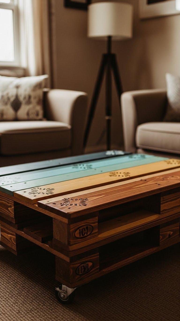 If your walls already sing with fabrics, bring that handmade warmth down to eye level with a painted pallet coffee table that echoes those colors and textures. You’ll sand, seal with a rustic stain for depth, then paint bold blocks or a subtle hue. Finish with a stenciled top for personality, add casters for freedom, and enjoy a functional, crafted centerpiece.