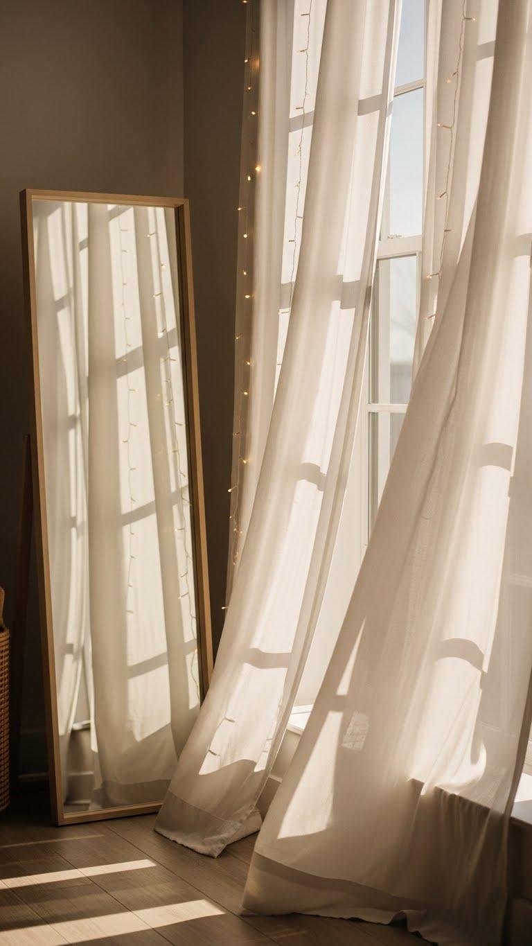 You’ll hang gauzy panels to soften sunbeams, angle mirrors for diffused reflections, and string window fairylights behind sheers for a soft glow. These tricks extend daylight, add depth, and keep your space feeling open, effortless, and free.