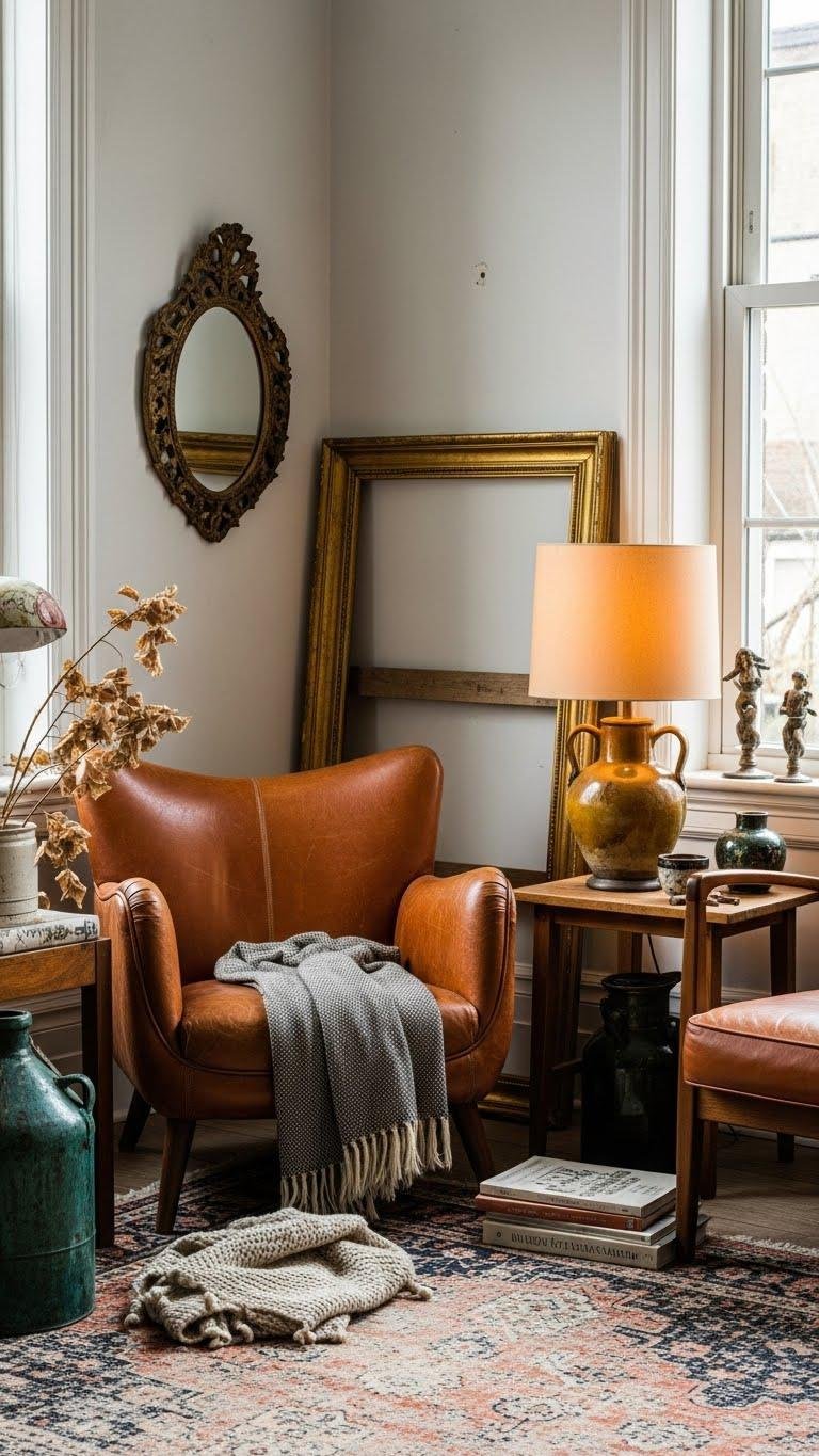 Let the soft light and mirrored reflections you’ve just created set the stage for bold, character-filled finds: vintage and thrifted pieces bring history, texture, and one-of-a-kind personality to that airy canvas. You’ll hunt patina frames, rescue a sculptural chair, and score flea market lamps that glow warm. Curate freely—mix eras, keep scale balanced, let stories lead your edit.