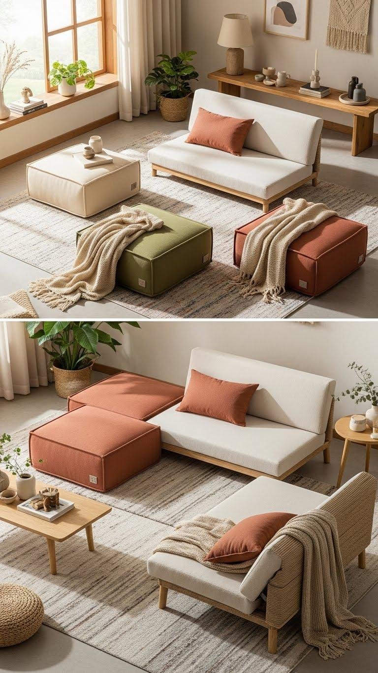 After layering rugs and throws to define a cozy footprint, think about seating that adapts to that map: compact modular pieces let you reorder a small plan into a sofa, chaise, daybed, or intimate conversation cluster in moments. You’ll choose modular ottomans for flexible surfaces and folding loveseats to tuck away when you crave space, creating a liberated, chic living rhythm.
