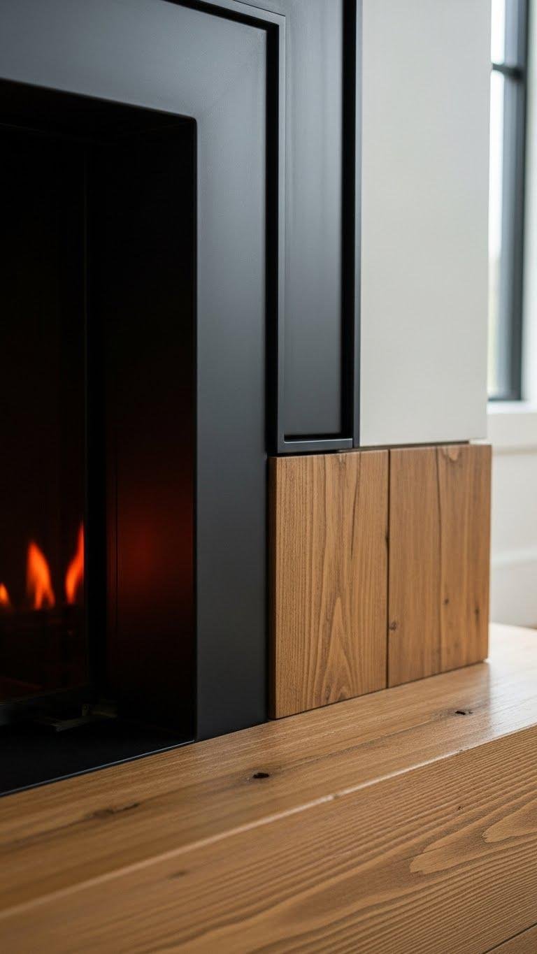 Combine matte black and warm wood for a two-tone fireplace surround that reads as contemporary and tactile—matte black metal or plaster provides a crisp, graphic frame while a natural wood inset or hearth introduces comforting grain and color. You’ll pair matte black hardware with a reclaimed woodgrain finish, balancing bold geometry and lived-in warmth so your fireplace feels liberated, precise, and effortlessly modern.