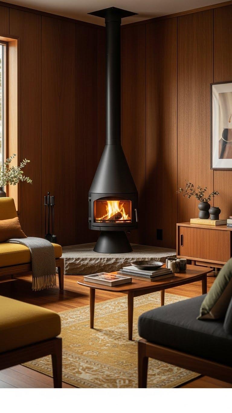 A freestanding midcentury stove or cone makes a striking, design-forward statement while delivering real, tactile warmth—place one in a corner or let it float as a sculptural anchor and watch the room come alive. You’ll love restored stoves and midcentury cones for their bold silhouettes; follow maintenance essentials, embrace vintage styling tips, and arrange seating to celebrate shape and freedom.